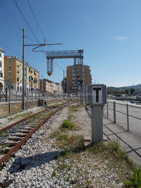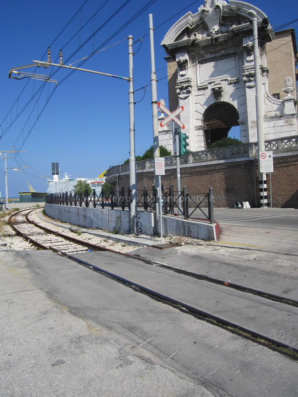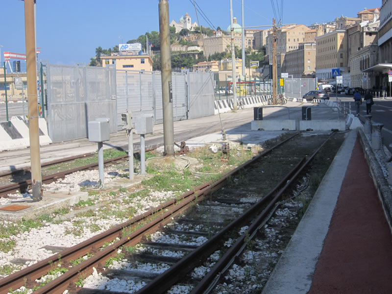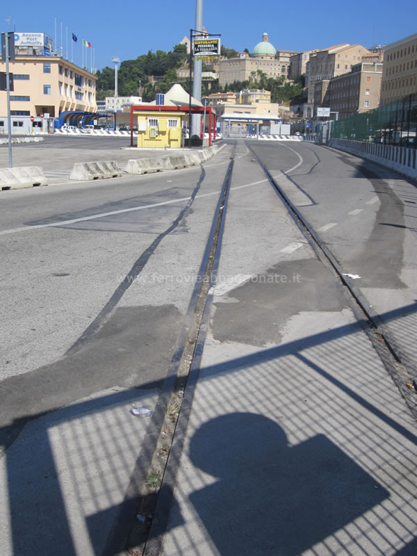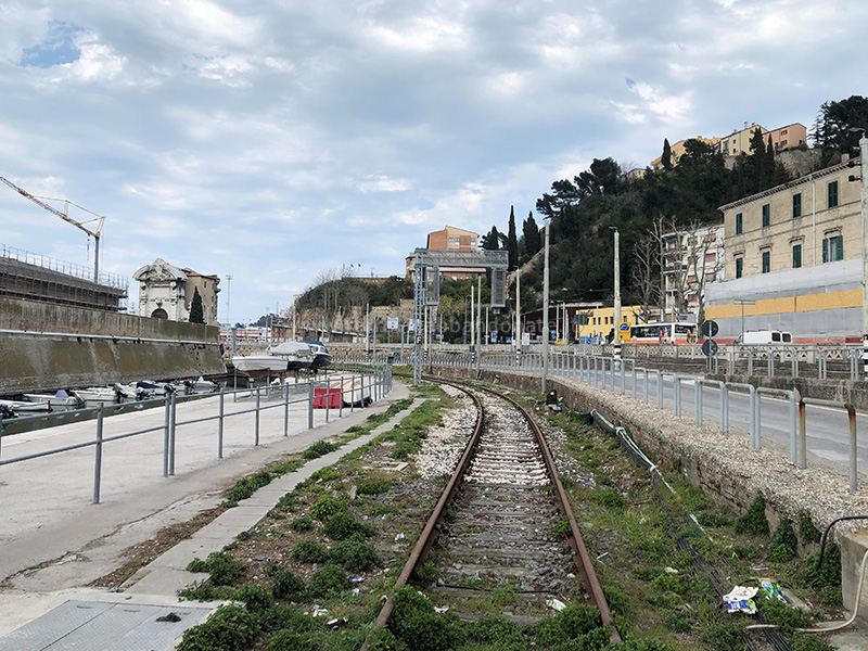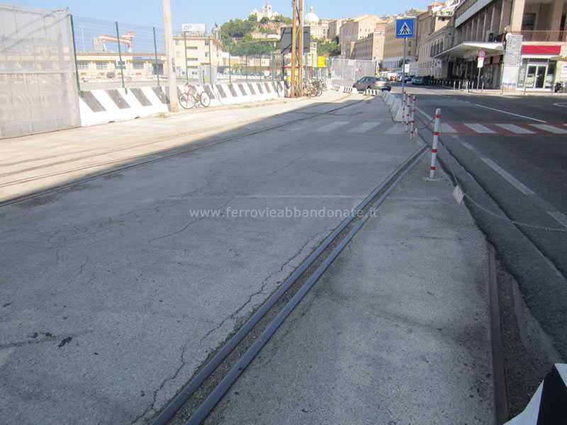 Vecchio binario, coperto dall'asfalto, che proseguiva verso l'originaria stazione di Ancona Marittima, costituita dalla pensilina che si vede sullo sfondo (A. Stigliani, 2016)
