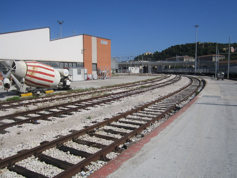 Estremità del fascio binari di Ancona, da cui si diparte la linea a singolo binario per Ancona Marittima (A. Stigliani, 2016)