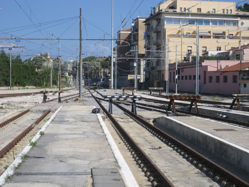 Blocchi di cemento al termine dei binari della stazione di Ancona Marittima (U. Polizio, 2016)