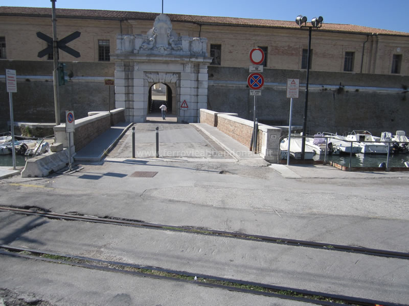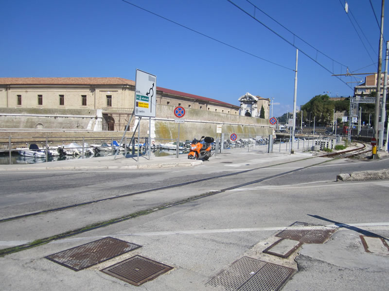 Passaggio a livello al km 1+064, di fronte all'ingresso della Mole Vanvitelliana (A. Stigliani, 2016)