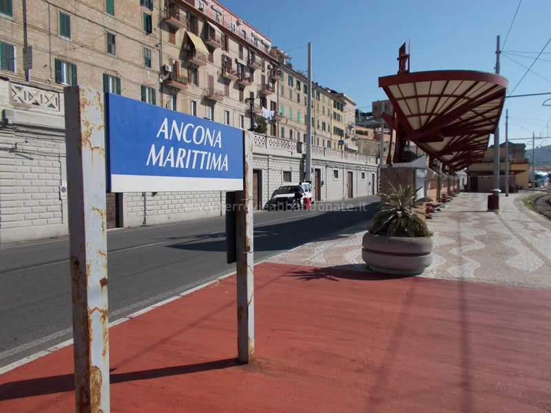 La stazione di Ancona Marittima sorgeva inizialmente più a nord ed era costituita da un fabbricato ad un solo piano, di stile non dissimile da quello degli adiacenti magazzini portuali. Distrutta dai bombardamenti del 1943-44, la piccola stazione fu sostituita da una semplice pensilina ricavata al piano terra dell'edificio che ospita, tra gli altri, la sede RAI di Ancona, che ha inglobato l'area su cui sorgeva la vecchia stazione; con i lavori di ammodernamento realizzati per il Giubileo del 2000 è stata costruita una nuova stazione di Ancona Marittima, spostata un po' più a sud.