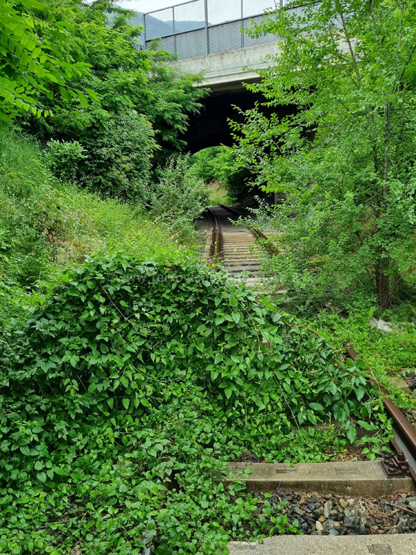 Binari della stazione di Prè-Saint-Didier coperti dalla vegetazione (A. Stigliani, 2022)