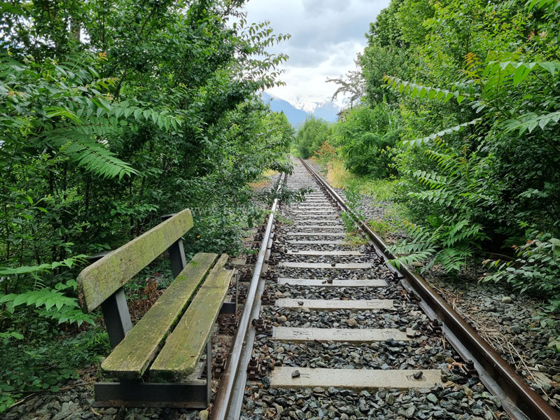 Sede ferroviaria nei pressi della fermata di Aosta Viale Europa, con una curiosa panchina posta in prossimità del binario (N.H. Hjøllund, 2024)