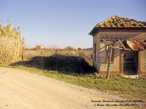 Vecchio casello ormai fatiscente ubicato all’attraversamento di Via Carlo Spelli, nei pressi di Guasticce (M. Mazzotta, 1988)