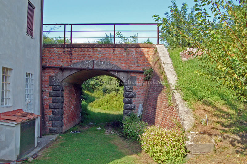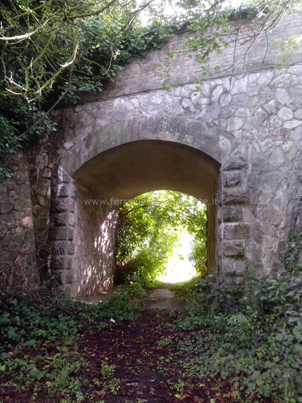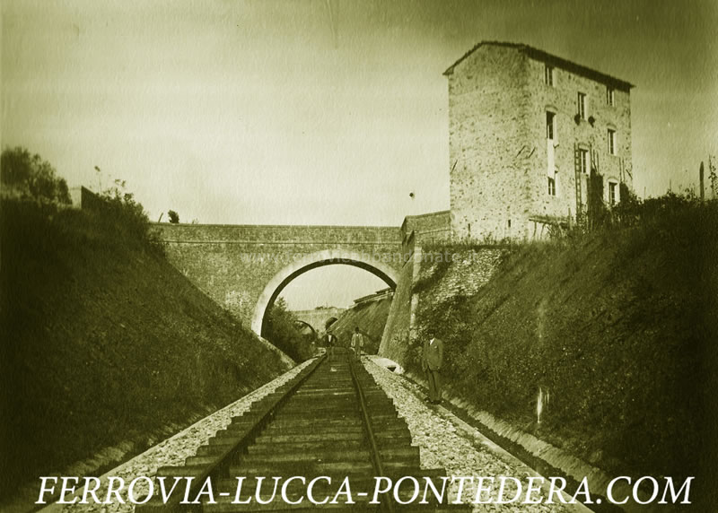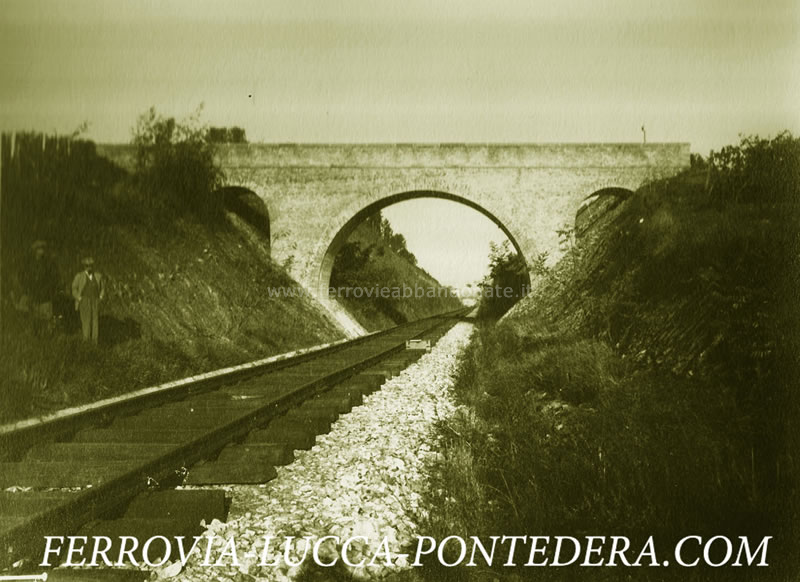 Immagine storica del sottopasso e del muro di sostegno al km 6,901, nei pressi di S. Leonardo (Fonte: <a href='http://www.ferrovia-lucca-pontedera.com' target='_blank'>www.ferrovia-lucca-pontedera.com</a>)