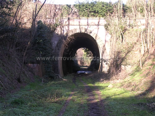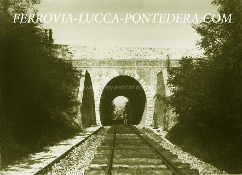 Immagine d'epoca della galleria subalvea al torrente Visona di Castelvecchio, nelle vicinanze della fermata di Castelvecchio di Compito (Fonte: <a href='http://www.ferrovia-lucca-pontedera.com' target='_blank'>www.ferrovia-lucca-pontedera.com</a>)