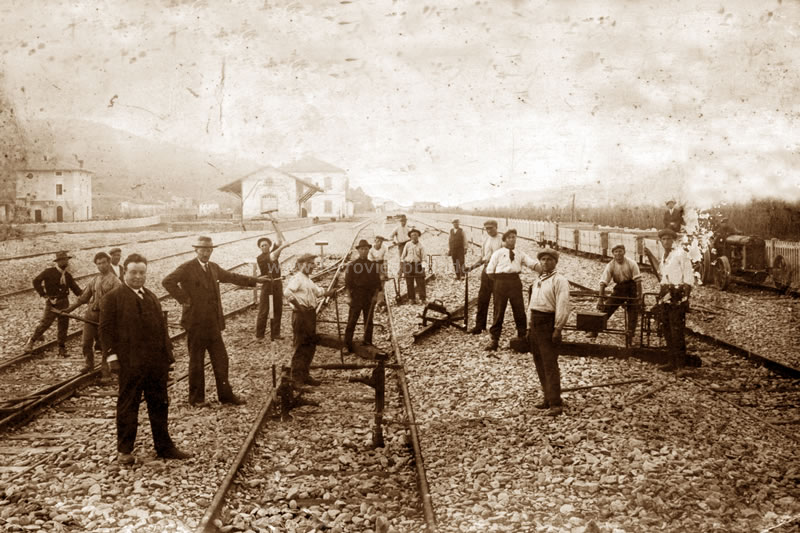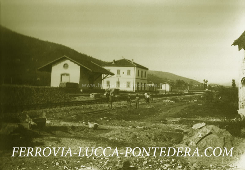 Foto d'epoca della stazione di S. Ginese-Pieve di Compito durante i lavori di costruzione (Fonte: <a href='http://www.ferrovia-lucca-pontedera.com' target='_blank'>www.ferrovia-lucca-pontedera.com</a>)