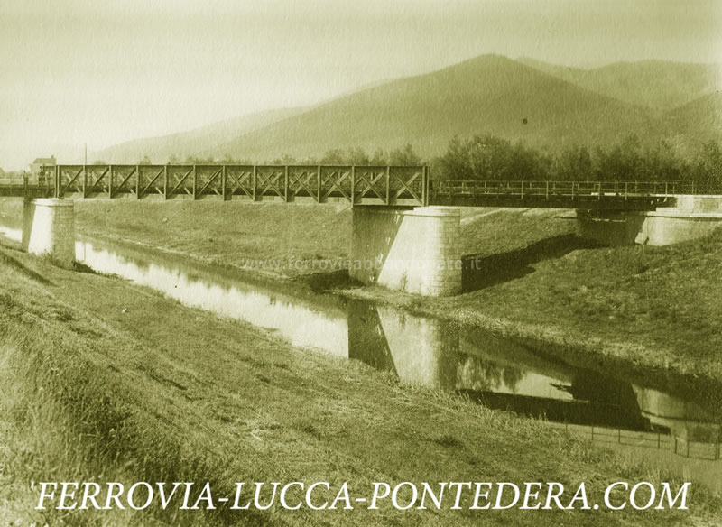 Immagine storica del ponte in ferro sul canale Rogio, tra le stazioni di Toringo-Parezzana e S. Leonardo-S. Andrea (Fonte: <a href='http://www.ferrovia-lucca-pontedera.com' target='_blank'>www.ferrovia-lucca-pontedera.com</a>)