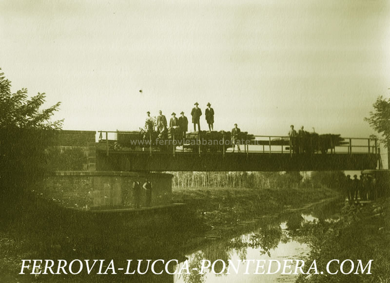 Foto d'epoca del ponte obliquo in ferro sull'emissario di Bientina, nelle vicinanze della stazione di Buti-Cascine (Fonte: <a href='http://www.ferrovia-lucca-pontedera.com' target='_blank'>www.ferrovia-lucca-pontedera.com</a>)