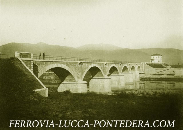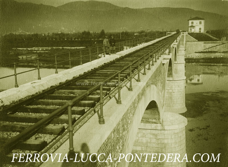 Immagine storica del ponte sul fiume Arno nei pressi di Calcinaia (Fonte: <a href='http://www.ferrovia-lucca-pontedera.com' target='_blank'>www.ferrovia-lucca-pontedera.com</a>)