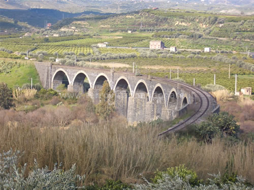 Imponente viadotto in curva tra le ex-stazioni di Schettino-S. Maria di Licodia e Mandarano Centuripe (G. Senes, 2005)