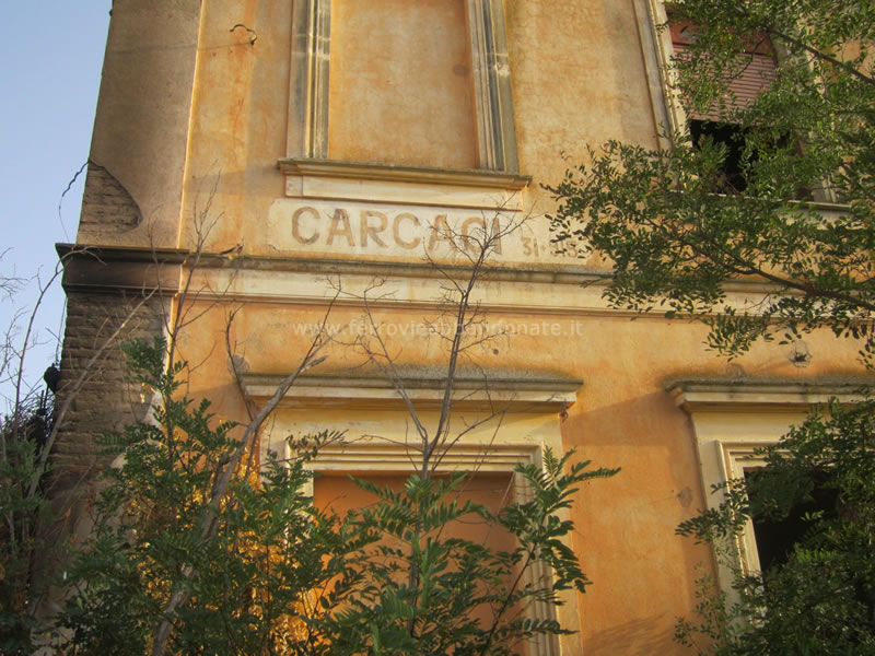 Particolare della ex-stazione di Carcaci, con la denominazione e la progressiva ancora leggibili (S. Mazza, 2014)