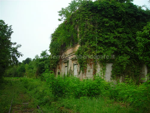 Ex-stazione di Valeriano: la rigogliosa vegetazione spontanea ha ricoperto quasi interamente il fabbricato viaggiatori e il binario (G. Altavilla, 2009)
