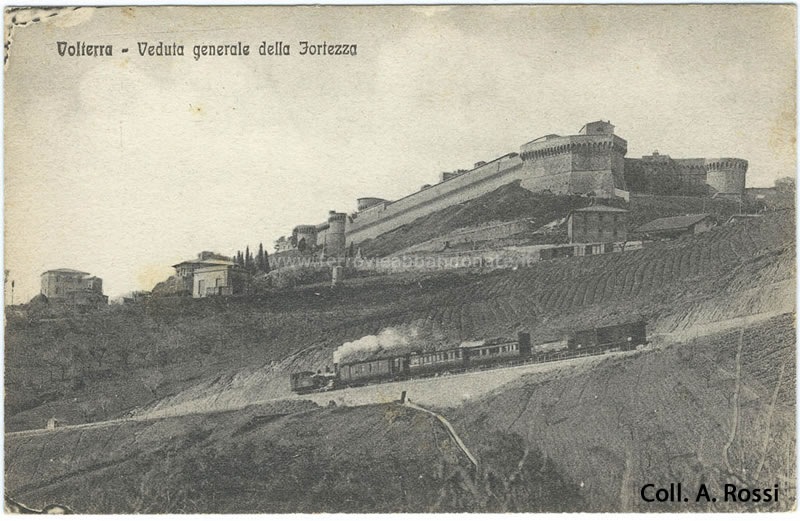Cartolina storica con un treno in corsa sul tratto a cremagliera ai piedi della fortezza medicea di Volterra (archivio A. Rossi)