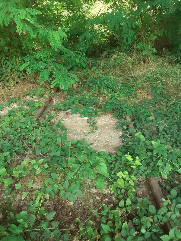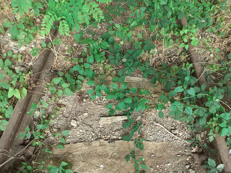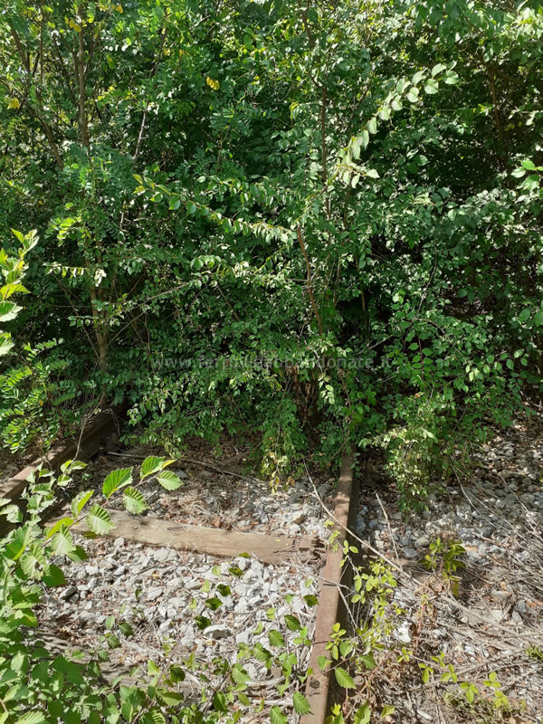 Binari coperti dalla vegetazione infestanti in corrispondenza della stazione di Montesano-Buonabitacolo (A. Stigliani, 2018)