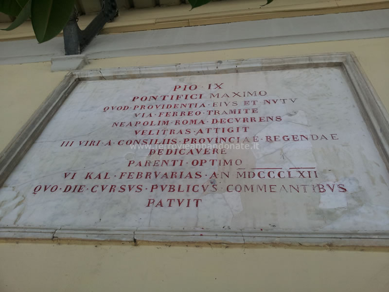 Targa nella stazione di Velletri a ricordo dell'inaugurazione della linea da parte di Papa Pio IX (A. Conti, 2016)