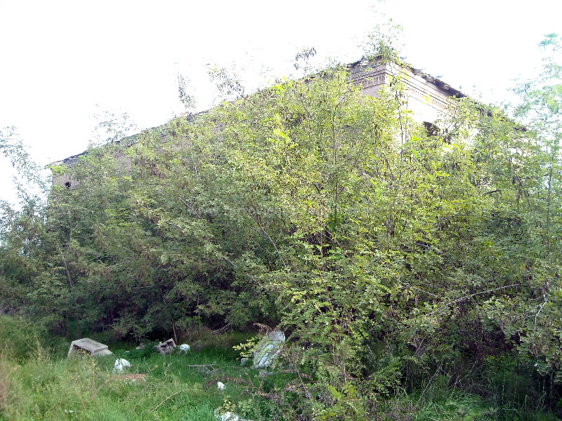 Fabbricato viaggiatori della ex-stazione di Ariano Polesine avvolto dalla rigogliosa vegetazione spontanea (E. Martino, 2012)