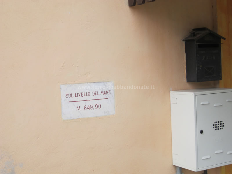 Particolare del fabbricato viaggiatori della ex-stazione di Atena Lucana, con l'indicazione della quota altimetrica: 649,90 m (A. Stigliani, 2018)