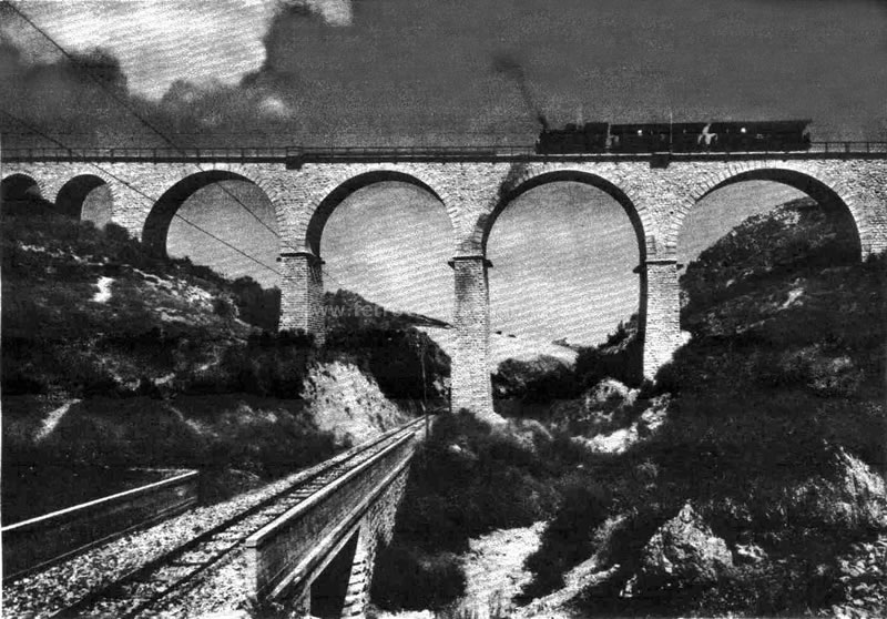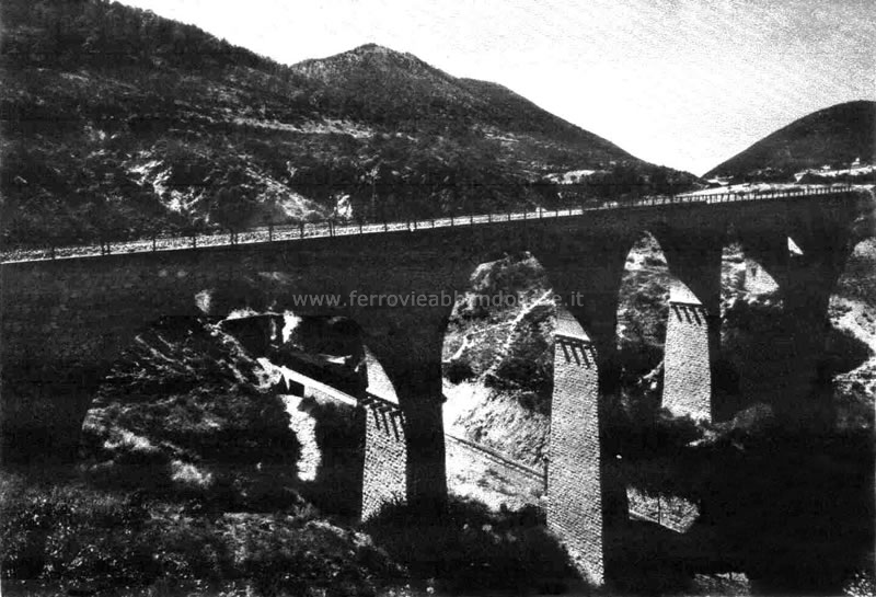 Foto d'epoca dell'elicoidale di Brienza, con in primo piano il viadotto Velasio e in basso l'uscita della galleria (archivio S. Sechi)