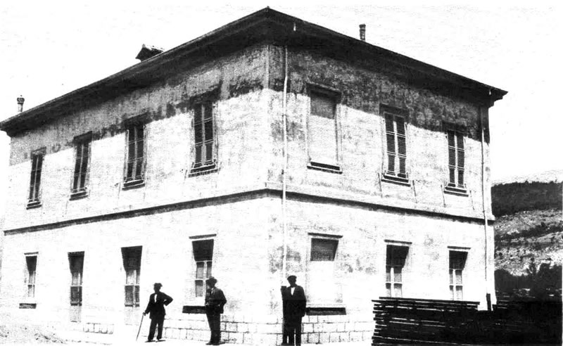 Foto d'epoca del fabbricato viaggiatori della stazione di Atena (FCL), che sorgeva di fronte alla corrispondente stazione FS (archivio S. Sechi)