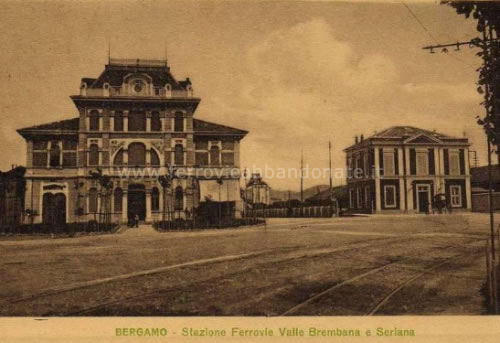 Cartolina storica con le stazioni di Bergamo-Ferrovia Valle Brembana, a sinistra, e Bergamo-Ferrovia Valle Seriana, a destra (archivio P. A. Marchese)