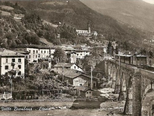 Immagine storica del viadotto sul fiume Brembo tra S. Pellegrino Terme e S. Giovanni Bianco con un treno in transito (archivio P. A. Marchese)