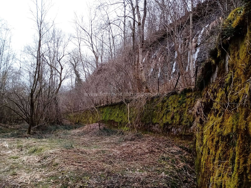 Sede ferroviaria, con il cippo del km. 6 e i resti di un muretto, nei pressi di Roè (S. Dell'Osbel, 2021)