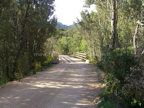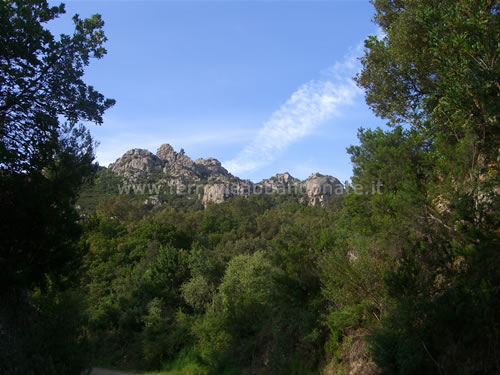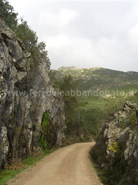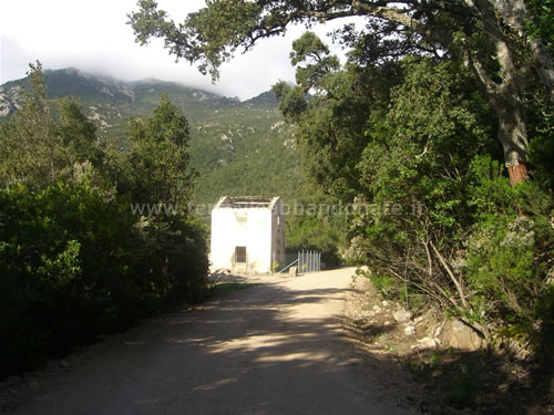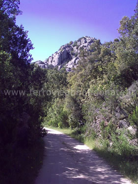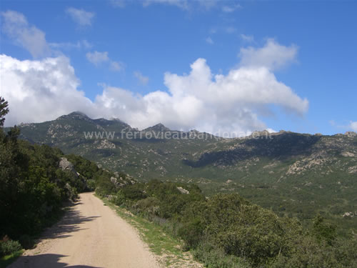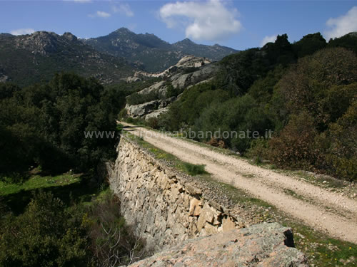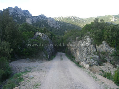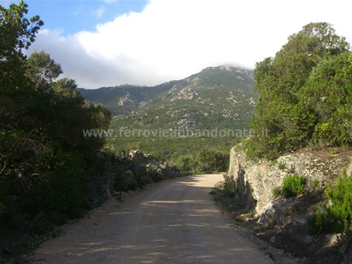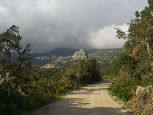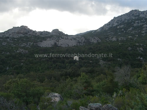 Boschi attraversati dall'ex-ferrovia ai piedi del massiccio del Limbara. In alto si scorge l'ex-casello n.11 (G. Mannoni, 2011)