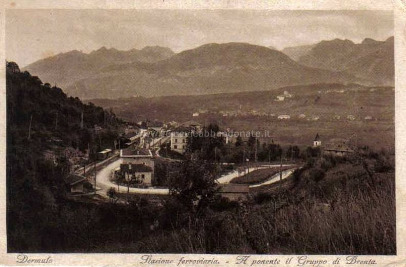 Immagine storica della stazione di Dermulo (FEAA), con la linea per Mendola che si allontana verso sinistra dalla Trento-Malè (archivio P. A. Marchese)