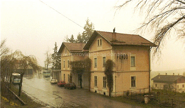 Ex-stazione di Fondo negli anni '60-70, con gli autobus che hanno sostituito la ferrovia (archivio P. A. Marchese)